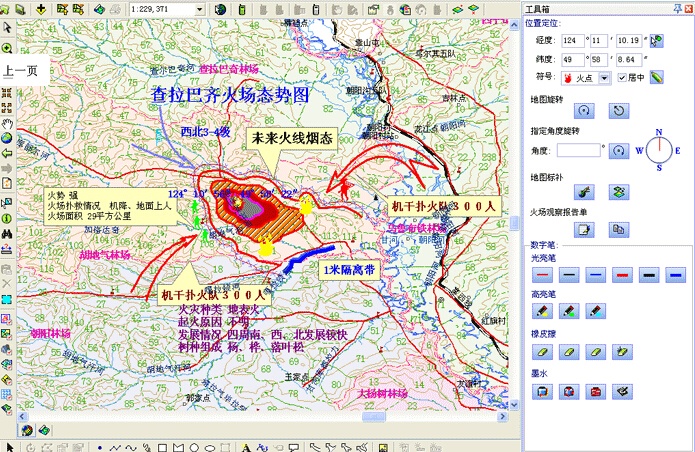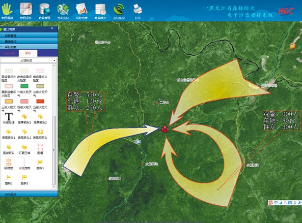偵查標繪系統(tǒng)可采集GPS信號,實現(xiàn)了在電子地圖上進行實時領航。觀察員可隨時在屏幕上看到自己的位置、坐標、航跡、 航線、航向、高度、速度、偏航距離等領航信息,又可直觀地在電子地圖上看到所在位置周圍的地物、地貌信息。標繪系統(tǒng)方便簡單的操作步驟,更適合實戰(zhàn)應用。同樣,救援隊伍亦可隨時知道自己的準確地理位置,并且指揮員可以利用GPRS和CDMA無線網(wǎng)絡,將標繪好的火場態(tài)勢圖和文字形式的火情報告及時上傳到上級應急指揮部門。