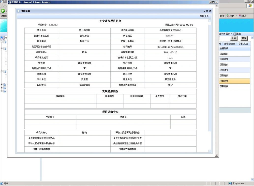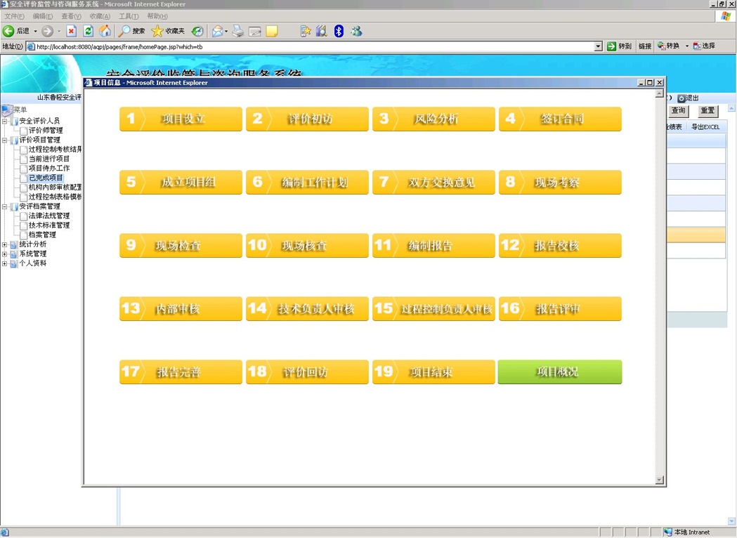 按照安評過程控制標準,結合安全評價機構的日常工作流程,對安全評價整個過程進行網絡化地控制和監管,根據風險分析、實施評價、報告審核、技術支撐、作業文件、內部管理、檔案管理和檢查改進八要素對所有評價項目過程進行嚴格把關,要求安全評價機構將現有項目的進度情況及時上報到系統中,規范安全評價機構工作流程,實現安全評價過程控制的信息化,在方便安全評價機構內部管理的同時有利于監管部門對安全評價機構的評價行為進行實時動態的監督管理。