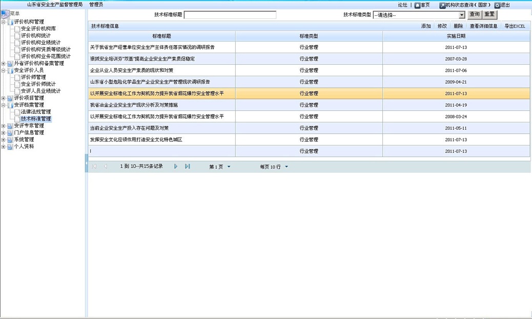 依據安全評價過程控制上報的數據對安評機構業績、安全評價人員業績進行智能統計匯總,并上報至國家安監局。可根據安全評價機構、年份、安全評價人員等條件進行查詢,查看、導出、打印安評機構或安全評價人員的業績表;可以統計分析比較各安評機構的業績,為安全評價機構的定期考核提供依據。