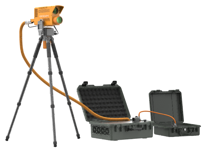 光學破拆裝置內置高能光纖激光器,能夠從地面發射激光對鋼板、鋁板、鋼筋、彩鋼瓦、樹木、塑料、馬蜂窩等進行遠距離切割清除。
