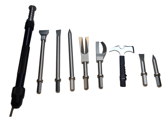 手動(dòng)破拆工具手動(dòng)破拆工具組由1個(gè)多功能手柄和與其配合使用的5個(gè)沖擊式破拆器工具頭、2個(gè)撬斧工具頭(包括1個(gè)金屬切割器工具頭和1個(gè)撬鎖拔釘器工具頭),伸縮式多功能消防斧、斧頭(多功能工具)和消防腰斧組成。