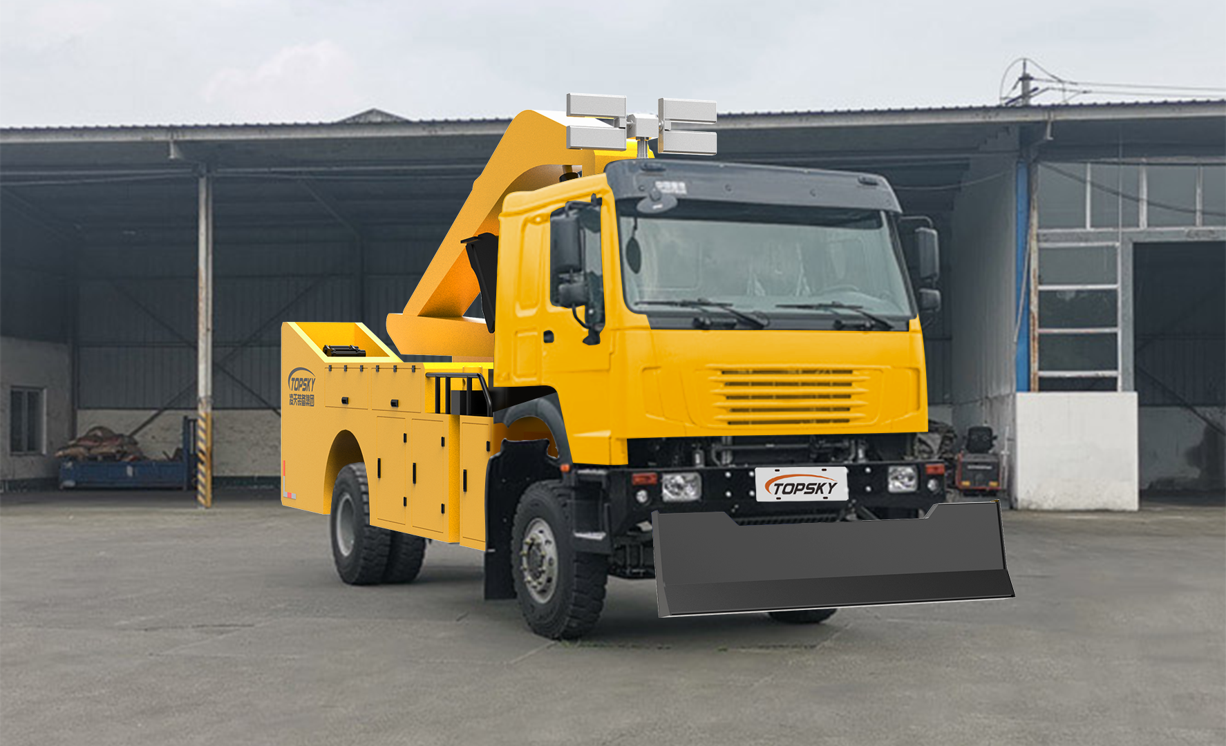 JY40/338是一款多功能輕型應急救援車,用于洪澇災害引起的建筑倒塌,道路損毀等搶險救援場景,車輛采用4×4全驅(qū)動越野底盤改裝,通過性能好,具有專用作業(yè)臂架,配置并隨車運輸挖斗、破碎錘、抓斗三種輔具,可與作業(yè)臂架快速安裝并更換,實現(xiàn)起重、挖掘、破拆、抓取功能,車輛前方具有快裝卸式推鏟,后方具有牽引絞盤等裝置,駕駛室頂部安裝升降照明燈,整車具備起重、挖掘、破拆、抓取、發(fā)電、照明、破障、牽引等功能,實現(xiàn)對災害現(xiàn)場應急救援作業(yè)。