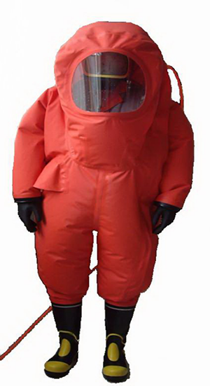 2、結構特征:服裝為連體式全封閉結構,外置背囊可佩帶正壓式空氣呼吸器,頭部裝有單項通風閥(排氣),接縫處牢固緊密,且用于高溫熱封機加溫高壓連接合縫,面屏為硬質透明PC材質(抗沖擊,耐酸堿)耐酸堿防化手套采用卡環可拆卸式連接,具有良好的密性,且便于更換。