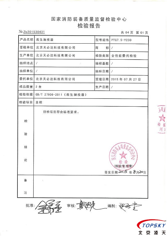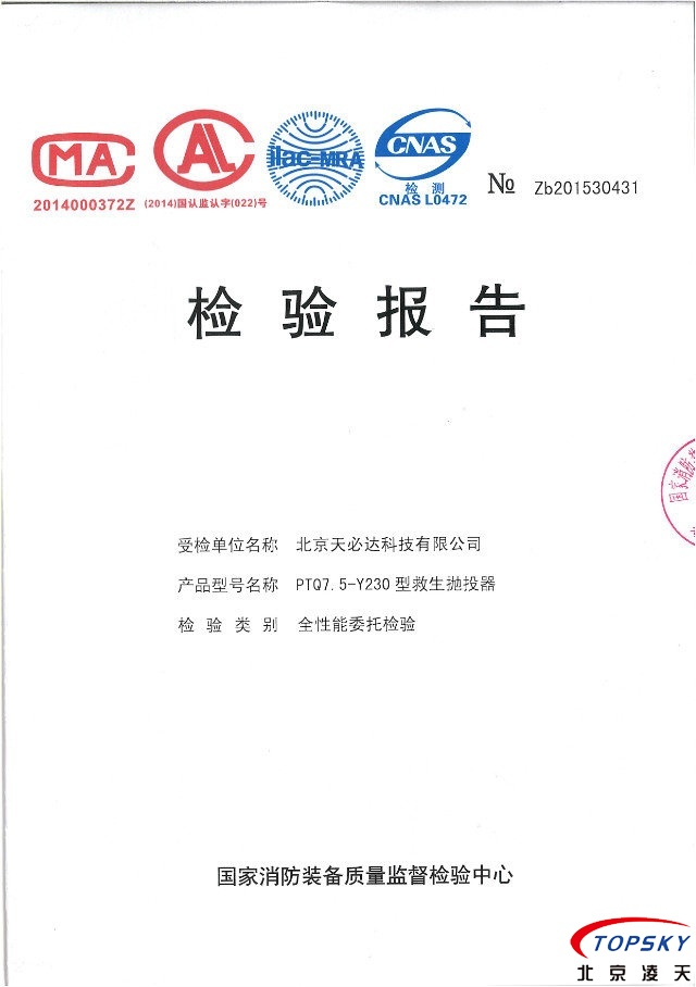 PTQ7.5-Y230型氣動遠(yuǎn)距離救生拋投器取得消防檢測報(bào)告。