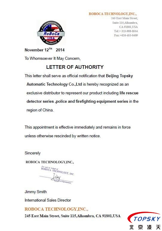 北京凌天成為美國ROBOCA公司在亞太區的總代理, 美國ROBOCA公司是反恐,救援裝備的制造商,主要產品包括氣動支撐系統,雷達生命探測儀,排爆機器人等.