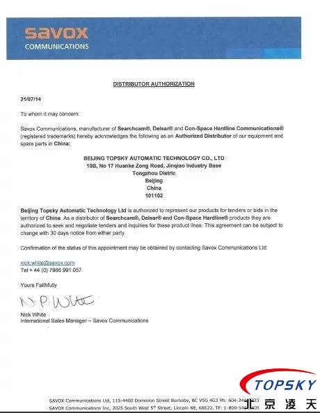 美國SAVOX視頻,音頻探測儀授權書