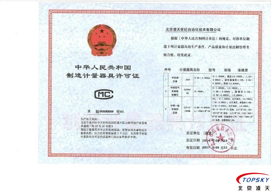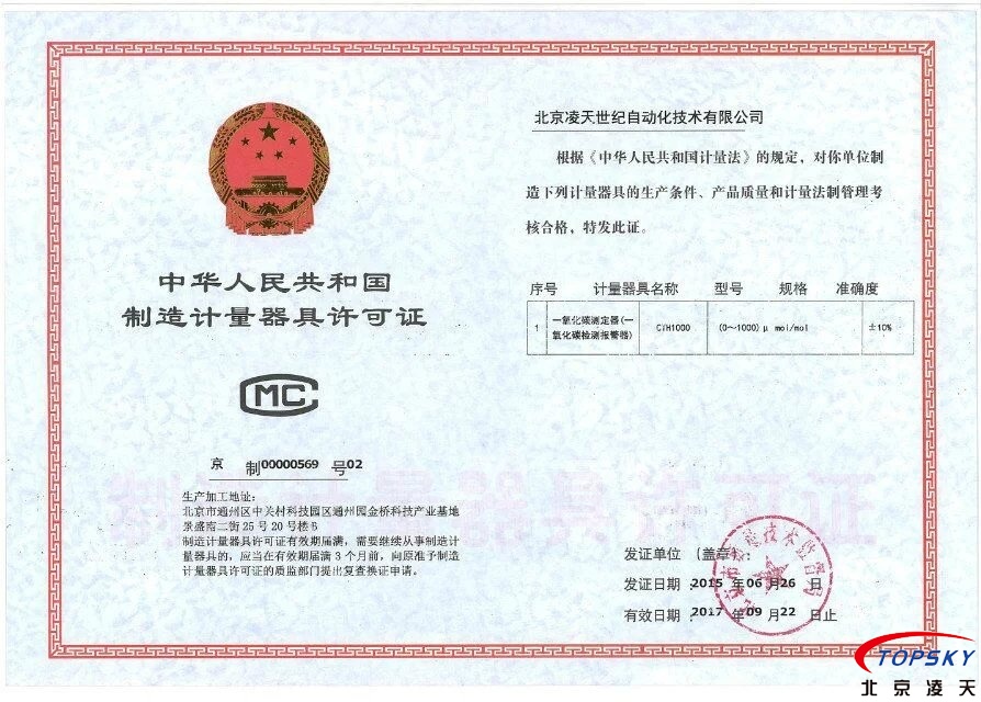 北京凌天一氧化碳檢測儀取得計量器具制造許可證(CMC)