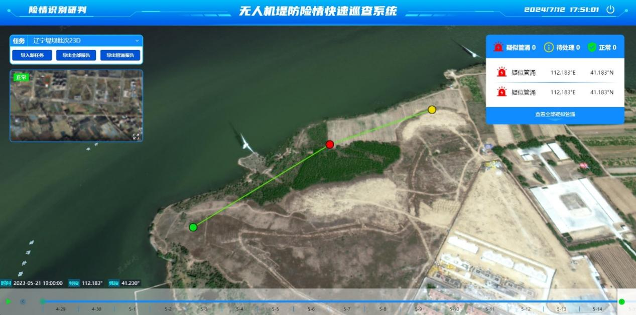系統(tǒng)主要針對汛期堤防滲漏、管涌、塌陷場景進(jìn)行快速排查隱患需求,以無人機(jī)搭載雙光相機(jī)匹配原理,結(jié)合人工智能辨識算法形式進(jìn)行巡查;系統(tǒng)設(shè)計(jì)化繁為簡,具備GIS高清底圖,能夠展示村莊、河道名稱及經(jīng)緯度信息,數(shù)據(jù)支持一鍵處理,保障高效運(yùn)行。
