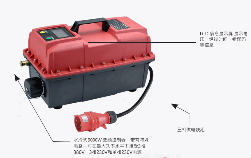 為高頻破拆工具組提供變頻電源,輸出功率可達(dá)9000W。內(nèi)建漏電斷路器的變頻控制器提供充分的電子保護(hù),可用于高低電壓/溫控保護(hù)以及對(duì)工具產(chǎn)生高電流的電流保護(hù)。