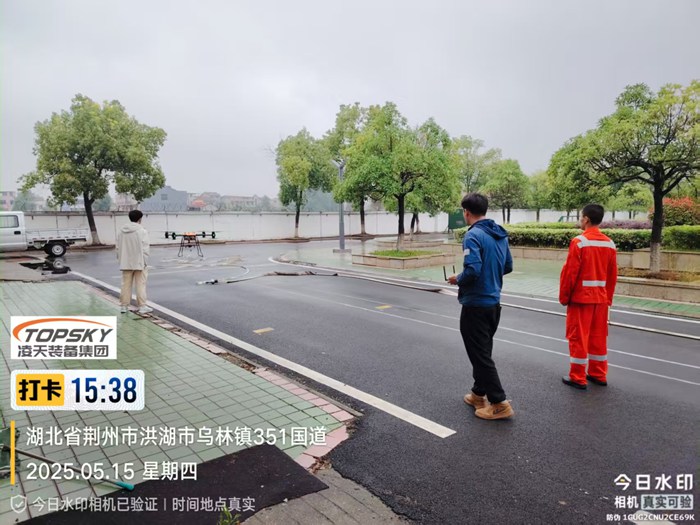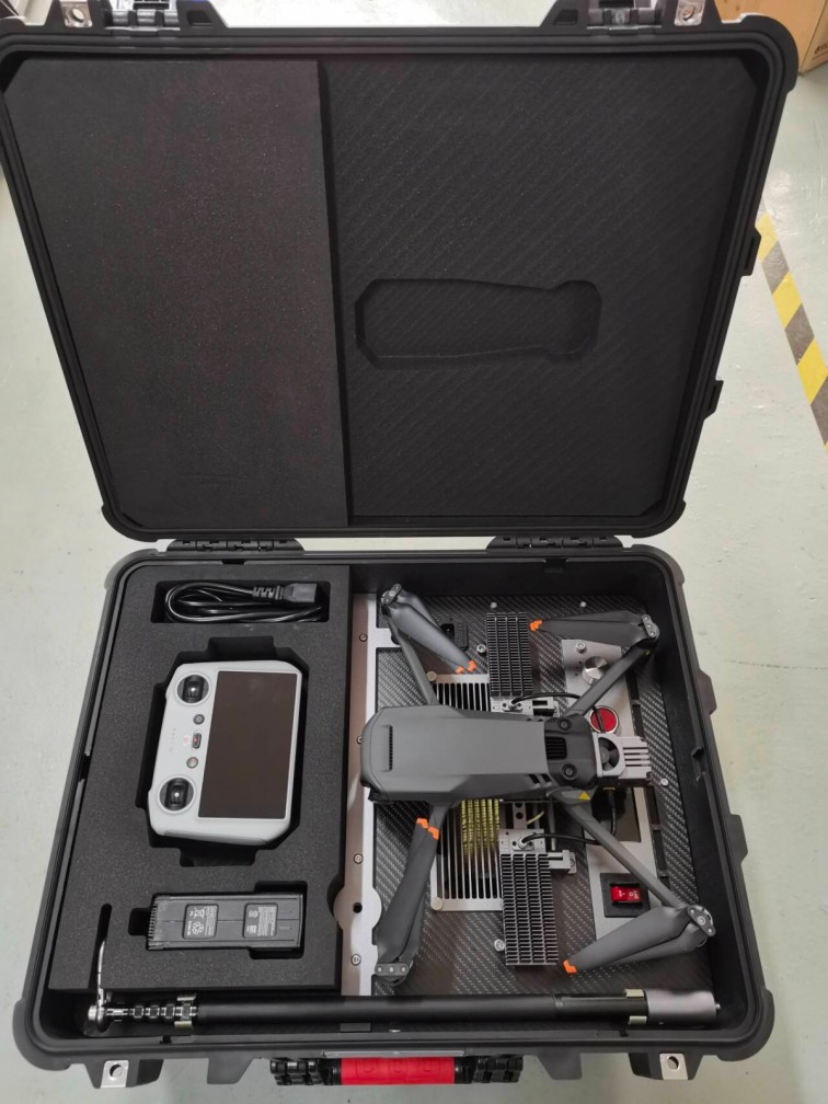 該無人機可裝載在消防車上,能快速啟動升空,通過特制高壓水帶與消防車水罐連接,消防車水罐內部高效泡沫/水基滅火劑輸送到無人機平臺,在水槍噴口水平噴射出去,達到滅火的效果。