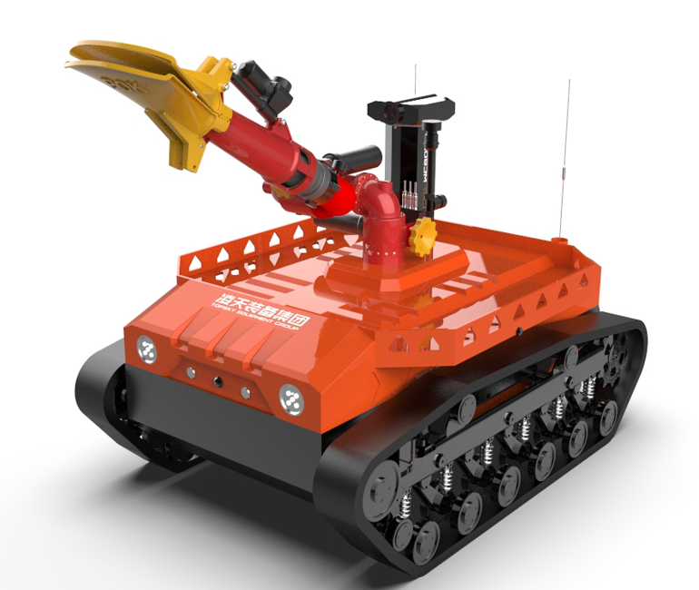 機器人采用無線遙控設計,遙控器與監視器一體/分離,可實時的顯示電池、內部的各種信息,機器人狀態、現場溫濕度、有毒有害氣體濃度報警信息等控制機器人前進、后退、轉向等運動。具備遠程偵察能力,機身搭建升降云臺、高清攝像頭、熱成像攝像頭、氣體傳感器三類環境感知設備和云臺控制設備,也可聯動聲光報警模塊提醒消防人員或群眾,有效避免危險。在通過遠程偵察手段有效獲取現場火源信息后,機器人配備的大功率電機可以幫助消防人員將消防水袋拖拽至危險火源區域進行滅火,并能搭載各類國內、外的多種消防水泡,并能夠遠程控制發射水或泡沫。基于所配備的拾音模塊和揚聲器模塊,拾取現場環境聲音,即使消防官兵未靠近消防現場也能夠聽到搜救現場的群眾呼救聲,并通過揚聲器模塊與群眾進行現場對話。