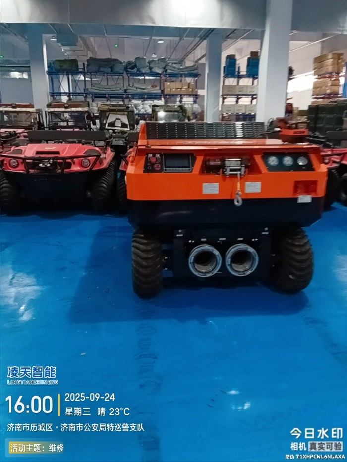 RXR-Q200L 排澇破拆一體化機器人采用汽油機為動力,液壓系統驅動,使用遠程無線遙控/有線遙控/車體操控。排澇破拆一體化機器人可用于城市車庫、地鐵站、隧道、涵洞、城市狹小道路等環境的排澇救援。當城市發生洪澇災害,導致地下車庫、地鐵、隧道等蓄水嚴重時,排澇破拆一體化機器人可實現快速排洪救援。本產品具備排水、音視頻偵察、水中漏電偵察、災區環境偵察等功能。本產品配套的水帶車可同時收卷2盤DN200大口徑水帶。機器人配備的水泵具有排污、放水、檢修等大口徑端口設置。