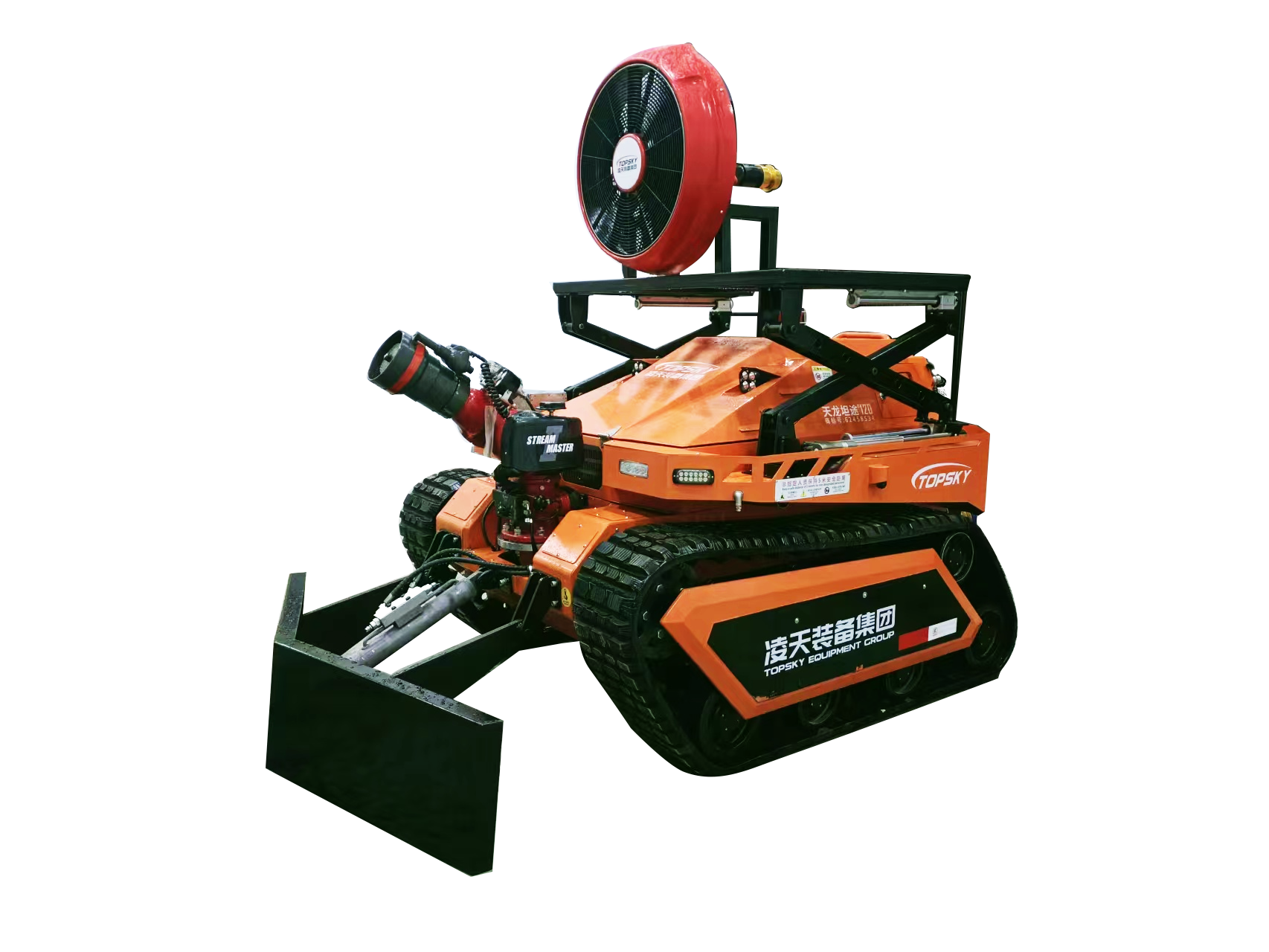 消防排煙滅火機器人是一款履帶式中型油動力消防滅火機器人,采用柴油發動機為動力,閉式液壓系統驅動ASV橡膠履帶進行高速行走,搭載了每秒120升的大流量消防炮,具有60000m3/h的可升降大流量水力排煙機,及V型推鏟,攜帶多種檢測、監控傳感檢測裝置,對火災場所實施遠程實時監控,進行火災撲滅、煙霧及有毒有害氣體驅散,道路開辟清障。