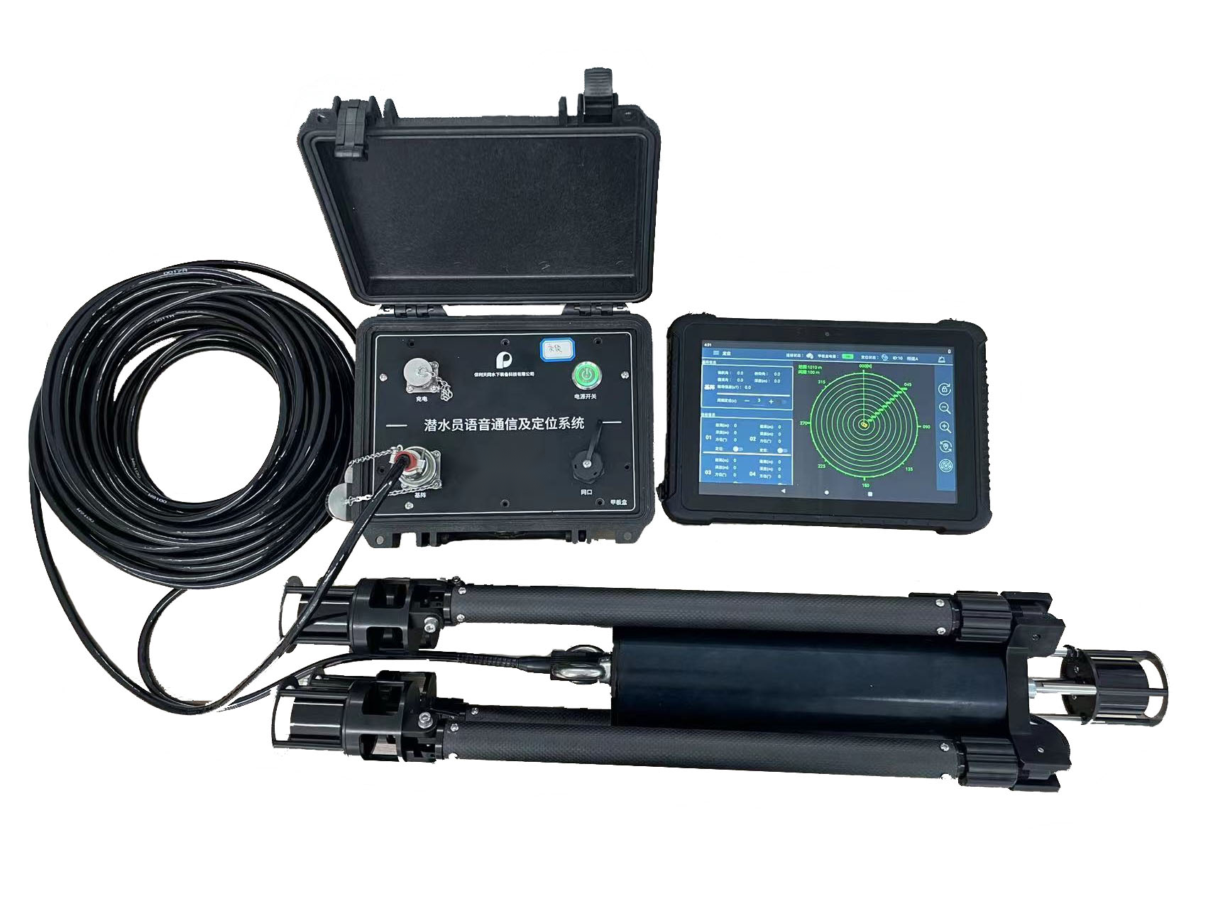 用于潛水員語音、數字通信及定位,具備水面指控系統、水面定位基陣、 水下潛水員單兵穿戴和顯示系統。通信距離1000-1500m,工作深度≥60m。