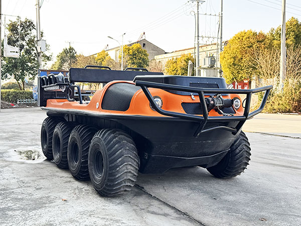 車體采用高分子復(fù)合材料真空一次成型,底盤采用高強(qiáng)度汽車大梁鋼材焊接而成,全密封設(shè)計適配全場景受力需求,同時確保車輛在水陸環(huán)境中均能保持穩(wěn)定。