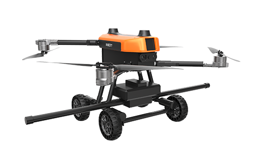 本無人機為北京凌天智能裝備集團研發的陸空兩棲航磁探測無人機,采用四旋翼機身設計,載重大,續航長,并且機體折疊標準化負載接口。同時,該無人機具備陸空兩棲功能,可以在地面行駛,行走系統可快拆。