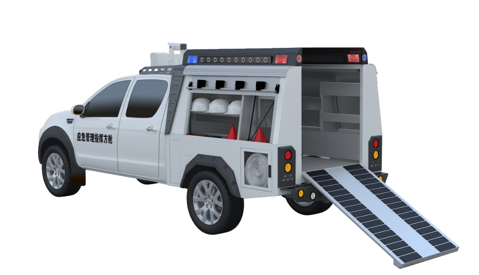 應急管理指揮方艙是基于現代化執法指揮開發的新型解決方案,將公務車輛+應急指揮+監管執法有效的融為一體,采用皮卡車型改裝,提升方艙整體能動性和實用性。方艙更結合了地面移動終端(執法儀)+空中監管無人機+地面重大危險源機器人等先進采集裝備,將移動執法終端通過IOT采集危險源數據、移動執法終端和執法記錄儀的采購數據全部可以實時上傳云端。