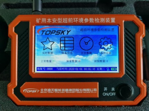 災區環境監測儀由礦用環境參數檢測探頭(以下簡稱探頭)和礦用本安型超前環境參數檢測裝置主機(以下簡稱主機)組成,主機與探頭通過無線進行通信。探頭具有實時連續檢測CH4、O2、CO、CO2、H2S、溫度共6種參數,并可超限報警。主機具有觸摸屏顯示,可實時顯示和存儲探頭檢測的環境參數數據,同時主機可以實現歷時數據曲線便于工作人員對環境參數的特性進行分析,同時主機具有藍牙功能,在井上可實現一鍵快速打印歷時數據。